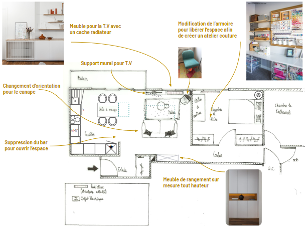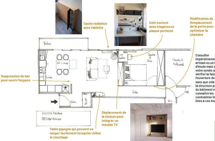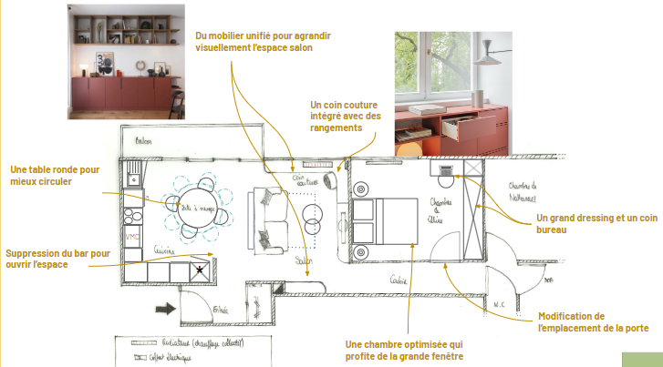 Les besoins : Optimiser le salon et la chambre et créer un espace couture